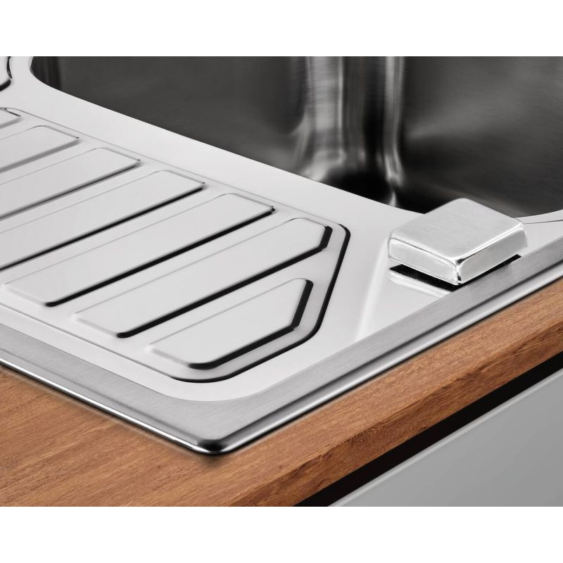 L'évier à encastrer Nava 3 permet de personnaliser la ligne de cuisine. Il offre un design de cuve fonctionnel avec une surface d'écoulement généreuse pour un grand confort lors de la vaisselle quotidienne ou du nettoyage des légumes. L'évier monocuve est fabriqué en acier inoxydable de haute qualité, résistant à la corrosion et à la chaleur. Grâce à sa surface non poreuse, ce matériau offre des caractéristiques insensibles et faciles à entretenir. L'évier en inox est disponible au choix en set avec le mitigeur monocommande Drive 1. La robinetterie haute pression chromée se caractérise par un bec haut et une commande latérale sans effort. L'évier en inox est prévu pour un montage en saillie dans la découpe du plan de travail. Le profilé de bordure forme une transition élégante. L'orientation de la cuve et de la surface d'écoulement peut être définie de manière flexible pour des aménagements individuels. Les perçages pour l'intégration de la robinetterie et de l'excentrique sont déjà préparés. Une vanne à panier avec garniture à excentrique rotatif ainsi qu'un système de vidage et de trop-plein font partie de l'équipement.