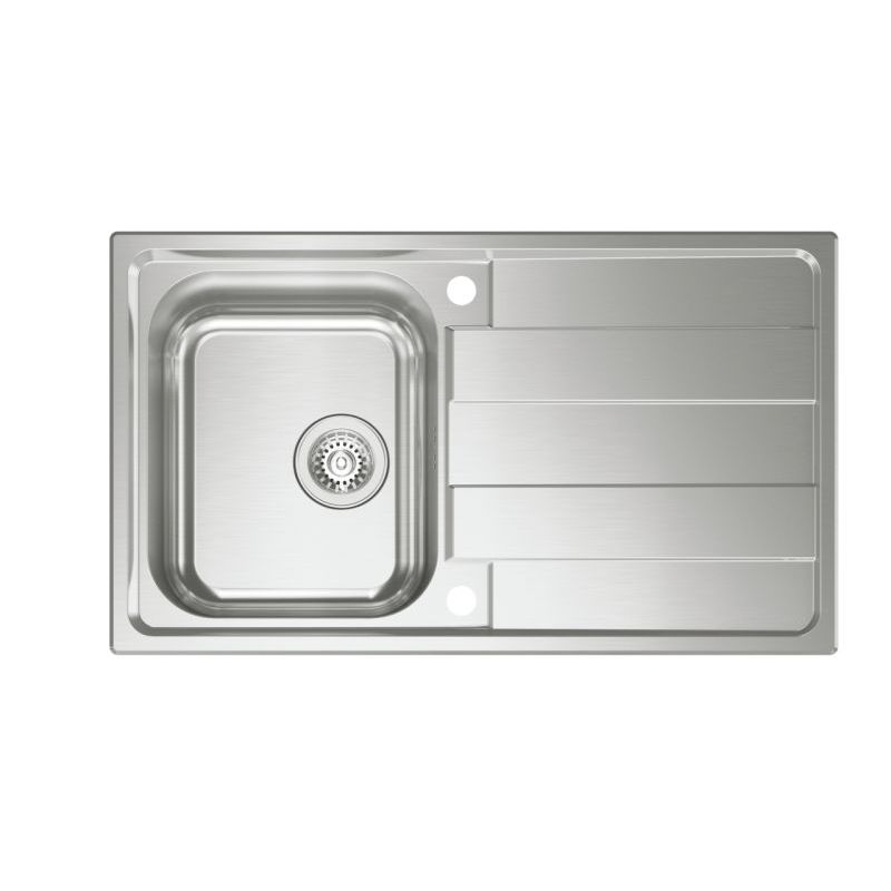 Évier encastrable. Avec surface d’égouttement, réversible. Soupape á tamis 3½", robinetterie à excentrique rotatif.
