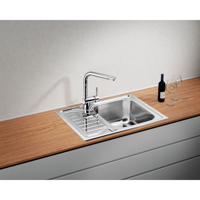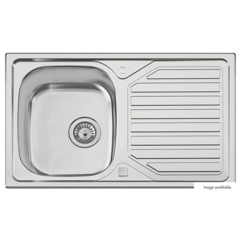 Évier encastrable. Avec surface d’égouttement, réversible. Soupape á tamis 3½", robinetterie à excentrique rotatif.