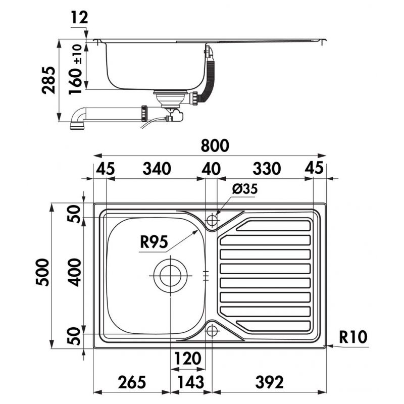 Évier encastrable avec robinetterie. Avec surface d’égouttement, réversible. Soupape á tamis 3½", robinetterie à excentrique rotatif.