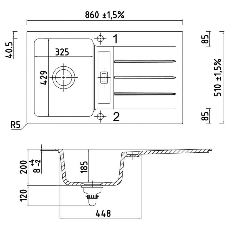 Évier encastrable. Céramique, bac individuel avec surface d'égouttement, réversible, soupape à tamis 3½" avec robinetterie premium à excentrique rotatif chromée, forage du trou 1 + 2 déjà foré.