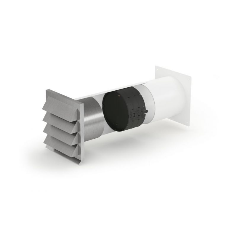Conçu pour s’adapter aux conduits d’air de 150 mm de diamètre, ce caisson mural est équipé d’un tube ajustable en profondeur de 350 à 500 mm, facilement recoupable jusqu’à 255 mm pour s’ajuster à différentes épaisseurs de mur. Il est associé à une élégante grille extérieure en acier inoxydable blanc, qui complète l’ensemble avec sobriété et efficacité. Le cœur du système repose sur la technologie THERMOBOX, un clapet isolant qui ne s’ouvre qu’à partir d’une pression de 65 Pa, éliminant ainsi les courants d’air froid, les pertes de chaleur en hiver, et les bruits parasites tels que les claquements métalliques que l’on retrouve dans les systèmes classiques.
