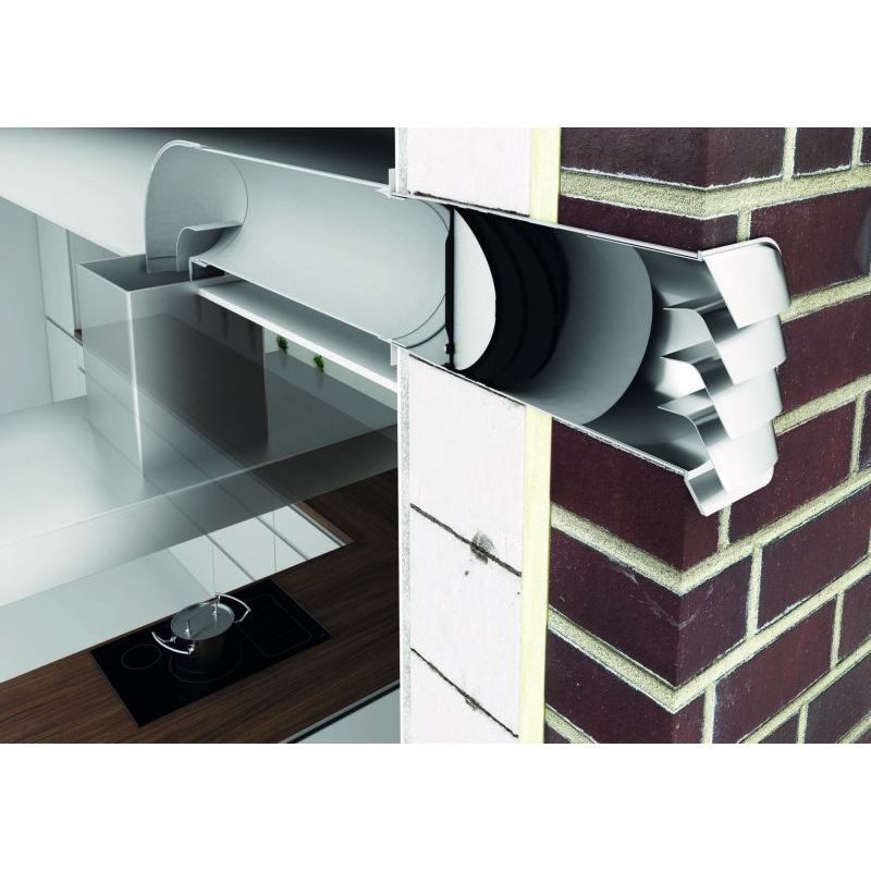 Le caisson mural COMPAIR® flow E-Jal 150 avec THERMOBOX intégrée améliore de manière décisive le climat ambiant en combinaison avec une hotte aspirante. Il conduit de manière fiable l'air vicié vers l'extérieur via le canal d'air. En même temps, le système empêche une perte de chaleur dans la pièce et la pénétration d'air froid extérieur. Ainsi, le caisson mural est équipé d'un tube télescopique qui contient le THERMOBOX, un système intégré de rétention de la chaleur. En combinaison avec la persienne extérieure en acier inoxydable E-Jal, on obtient une grande efficacité énergétique avec une perte de chaleur jusqu'à 20 fois inférieure à celle des clapets anti-retour standard. Il n'y a pas de vibrations ni de bruits de cliquetis. Le THERMOBOX, qui s'ouvre à 65 Pa, se distingue par une certification Blower-Door. Le caisson de maçonnerie, y compris le THERMOBOX, contribue ainsi efficacement aux économies d'énergie. Le raccordement du caisson mural à un conduit rond s'effectue à l'aide d'une tubulure/d'un tuyau d'un diamètre de 150 mm. La profondeur de montage du caisson mural varie de 350 à 500 mm, le tube pouvant être raccourci jusqu'à 255 mm - le passage convient ainsi à différentes épaisseurs de mur. Pour le montage, un passage mural d'un diamètre d'environ 155 mm est nécessaire.