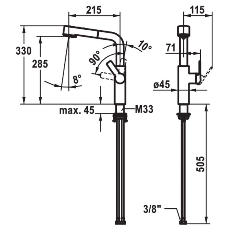 Mitigeur à bec unique. Avec douchette pivotante/extractible (jet/douchette commutable), manette latérale et cartouche céramique.