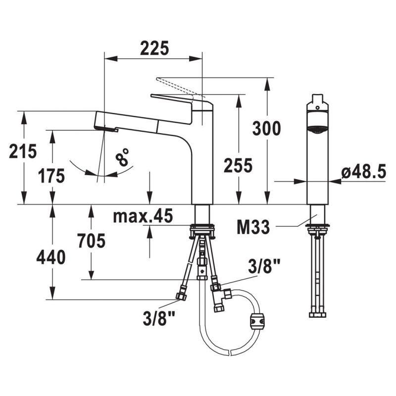 Mitigeur à bec unique avec douchette pivotante/extractible (jet/douchette commutable) et cartouche céramique.