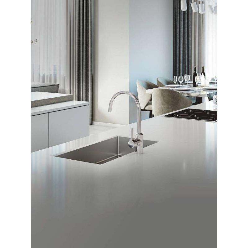 Mitigeur à bec unique. À tête pivotante, manette latérale et cartouche céramique. Robinet haute pression avec régulateur de jet laminaire.