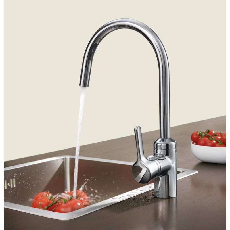 Le robinet de cuisine Bingo Star 2 attire l'attention pour la planification moderne de la cuisine. L'aspect visuel est principalement marqué par le bec en forme d'arc et très haut. Il offre une grande marge de manœuvre pour remplir de grands récipients. Une plage de pivotement possible jusqu'à 230° est un avantage supplémentaire lors de la manipulation. De plus, le bec est extractible afin d'orienter le jet d'eau ...