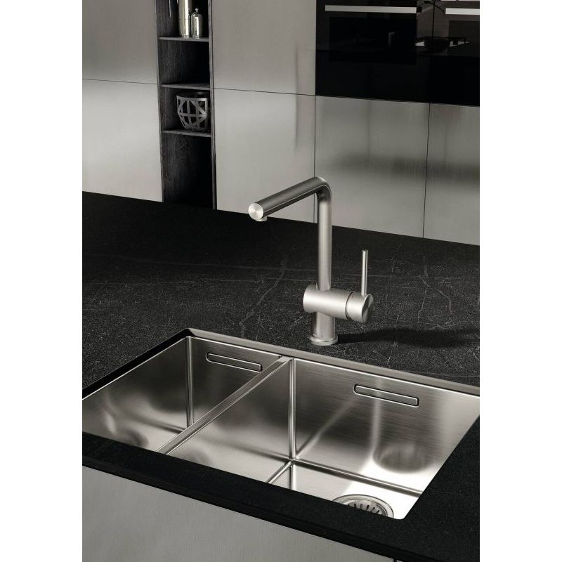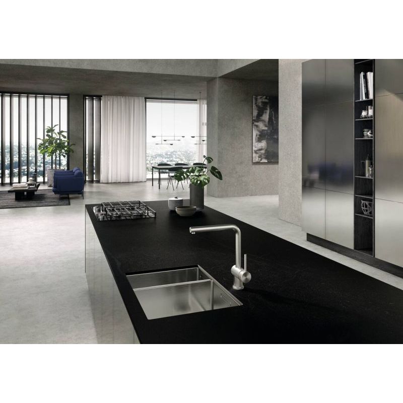 Une présence forte associée à une élégance froide : le mitigeur de cuisine Steel L1 de Kludi fait une déclaration claire dans la planification de la cuisine moderne. L'image d'ensemble est principalement marquée par le bec en forme d'arc. La plage de pivotement de 360° garantit une grande flexibilité. Le levier, qui tient bien en main, est placé sur le côté droit du robinet et peut être actionné avec précision. L'acier inoxydable utilisé pour la fabrication, à la fois pur et massif, en fait un véritable produit phare. Le matériau séduit par ses propriétés robustes et durables. Le toucher et l'aspect particuliers sont dus aux surfaces lisses et brossées. L'équipement de base comprend une cartouche céramique de haute qualité avec limitation réglable de l'eau chaude. Une fonctionnalité qui s'avère particulièrement utile lorsque des enfants font partie du ménage. De plus, elle permet de mélanger la quantité d'eau et la température dans un rapport optimal. La fixation sur tige incluse dans l'ensemble permet un montage stable du robinet haute pression sur le plan de travail.