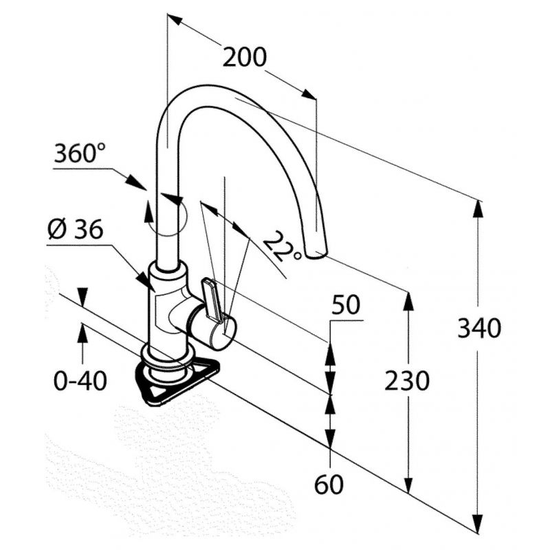 Mitigeur à bec unique. À tête pivotante, manette latérale, cartouche céramique et régulateur de jet laminaire.