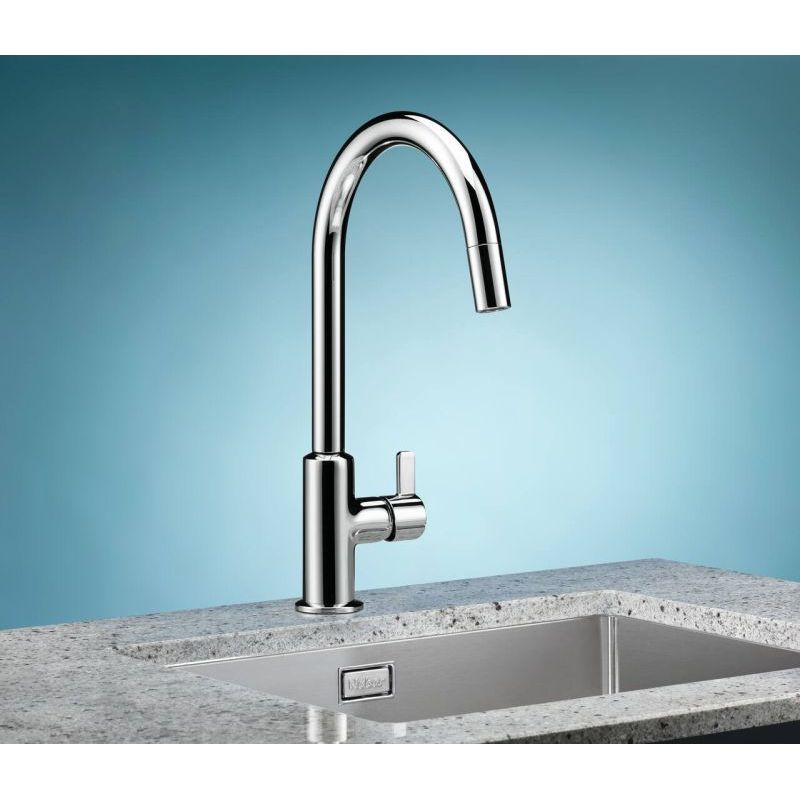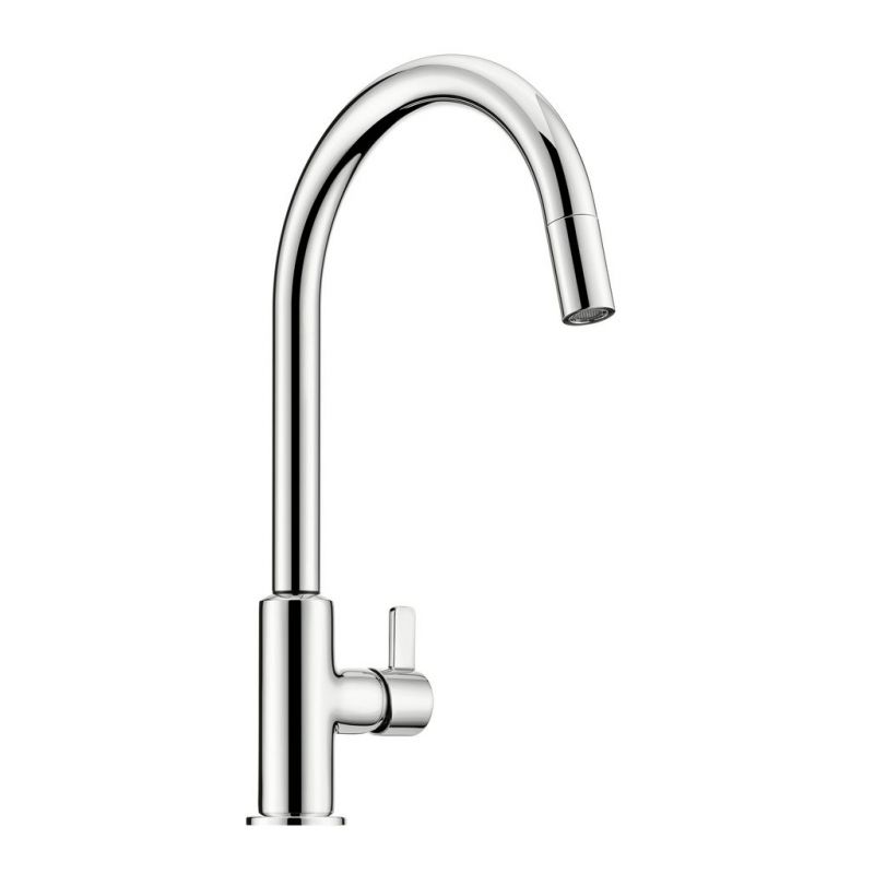 Mitigeur à bec unique. À tête pivotante/extractible, manette latérale et cartouche céramique.