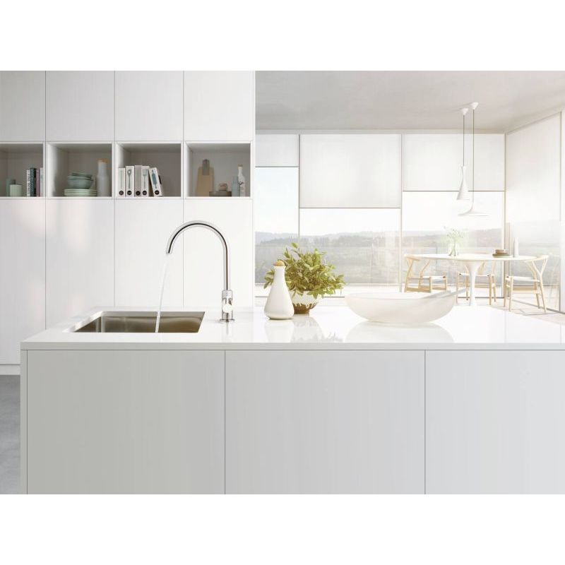 Lorsqu'il s'agit de concevoir une cuisine moderne et esthétique, le robinet de cuisine Bingo Star XS 3 de la gamme Kludi entre en jeu. La robinetterie se caractérise par le design élancé de l'écoulement. Grâce à sa hauteur et à son orientation jusqu'à 360°, il offre une grande flexibilité lors du travail à l'évier. La partie extractible de l'écoulement permet de diriger le jet d'eau de manière ciblée sur les tasses et les verres ainsi que sur les fruits et les légumes. Le levier de commande court est un autre point fort de la construction. Il permet de monter la garniture dans la zone d'une paroi arrière, ce qui économise de la place. Un régulateur de jet laminaire est intégré à l'extrémité de sortie. Il contribue à ce que l'eau s'écoule silencieusement et sans tourbillons d'air, pratiquement sans éclaboussures. Une cartouche céramique durable fait partie de l'équipement de base afin d'adapter la température le plus précisément possible aux besoins. Des tuyaux de raccordement DO-IT extra longs permettent d'intégrer le mitigeur sans tuyaux intermédiaires. Pour la robinetterie haute pression, il est possible de choisir entre une finition chromée ou noire mate.