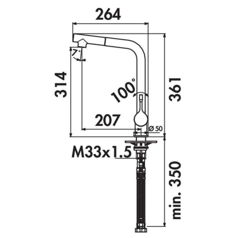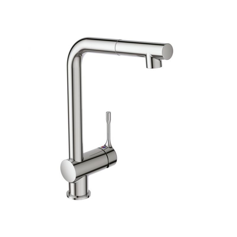Mitigeur à bec unique. À tête pivotante/extractible, manette latérale et cartouche céramique.