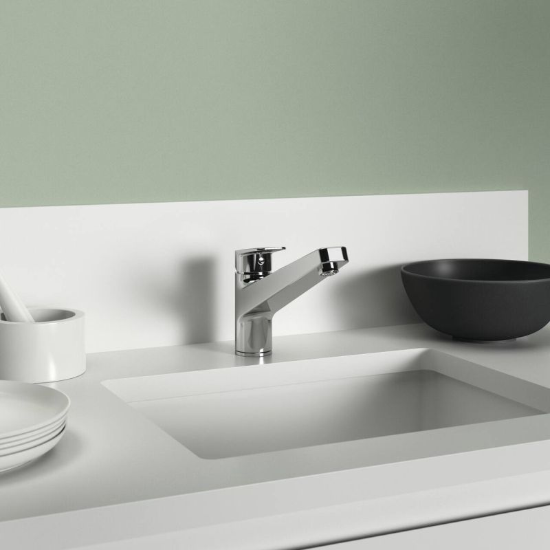 Avec son élégance sobre, le robinet de cuisine Ceraplan Neo 1 de la marque Ideal Standard s'intègre harmonieusement dans chaque évier. Son design clair et sobre, avec son bec en fonte placé en hauteur, est aussi convaincant à l'œil qu'au toucher. La zone de pivotement de 360° et le levier de mélange placé au centre assurent une utilisation confortable. Dans sa version haute pression, le robinet d'évier marque des points grâce à sa fonction ECO, qui permet d'économiser jusqu'à 50 % d'eau et de réduire la consommation d'énergie. Il est également équipé d'un régulateur de jet anticalcaire, facile à nettoyer grâce à sa surface en élastomère souple. Le mitigeur est fabriqué à partir de matériaux de haute qualité. Il séduit par sa finition chromée brillante et ses surfaces résistantes et faciles à entretenir. Afin d'éviter les brûlures dues à l'eau chaude, le corps du robinet est équipé d'une cartouche céramique avec réglage de la température maximale. En plus de la robinetterie haute pression, le modèle est disponible en version basse pression. Les deux variantes se distinguent par leur fixation Easy-Fix pour un montage simple.