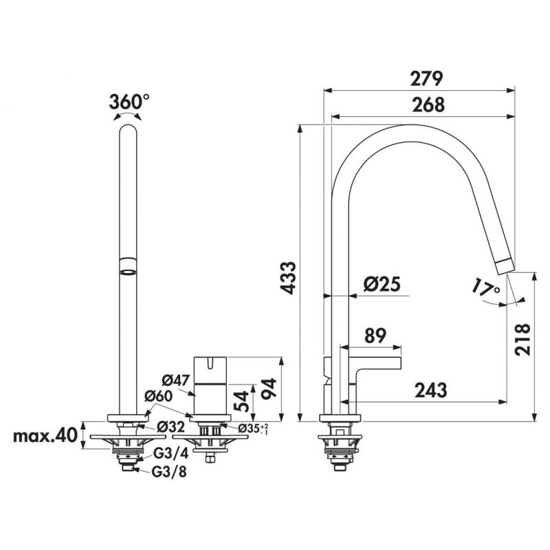 Mitigeur à bec unique - deux trous. À tête pivotante, manette et cartouche céramique à positionner séparément.