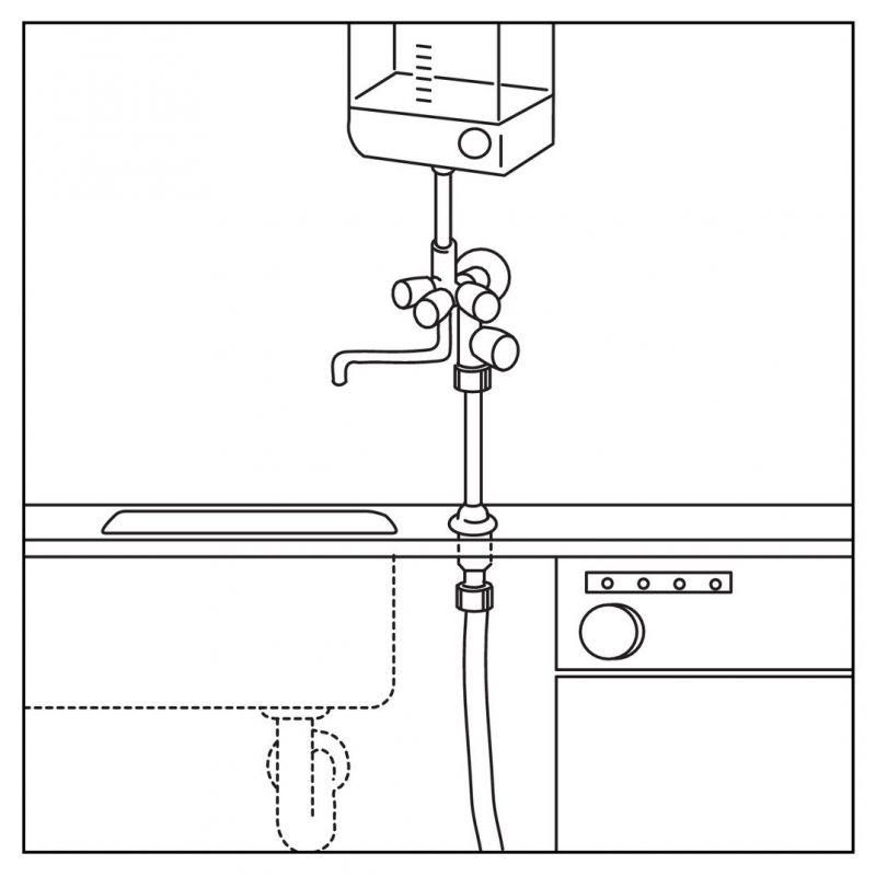 Le passage de rinçage convient pour un raccordement fiable de la conduite d'eau et du robinet de l'évier ou du mitigeur. Il est équipé d'un raccord de tuyau flexible. Comme le raccord possède une plage de réglage de 70 mm, il peut également être utilisé pour des plans de travail particulièrement solides ou des pièces moulées d'évier à parois épaisses. Le diamètre est de 12mm.