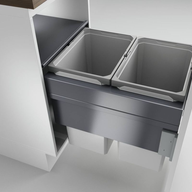 Il allie fonctionnalité et volume de déchets généreux : le système de tri des déchets Cox Clan® 490/500-2 en variante à extension supplémentaire. Les collecteurs de déchets faisant partie du set ont chacun un volume de 29,5 litres. Elles peuvent être retirées d'un seul geste pour être vidées et nettoyées. Pour éviter la formation d'odeurs dans la cuisine, elles sont recouvertes d'un couvercle général lorsqu'elles sont fermées. Il est en tôle revêtue et peut servir de support supplémentaire pour les ustensiles de nettoyage et les rouleaux de sacs poubelle. L'extension totale permet un accès complet. Il est équipé d'une glissière souple et d'un amortisseur de butée à fermeture silencieuse. Le cadre de montage quick&easy permet de fixer le système de tri des déchets avec précision sur la paroi de l'armoire et de le fixer également sur le panneau frontal. Des modèles de différentes tailles sont disponibles dans la série.