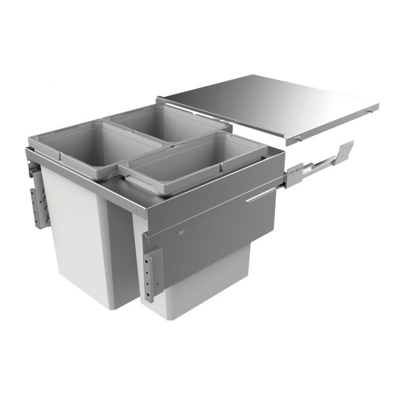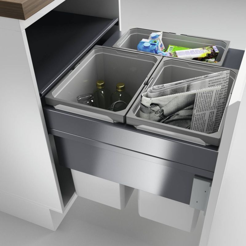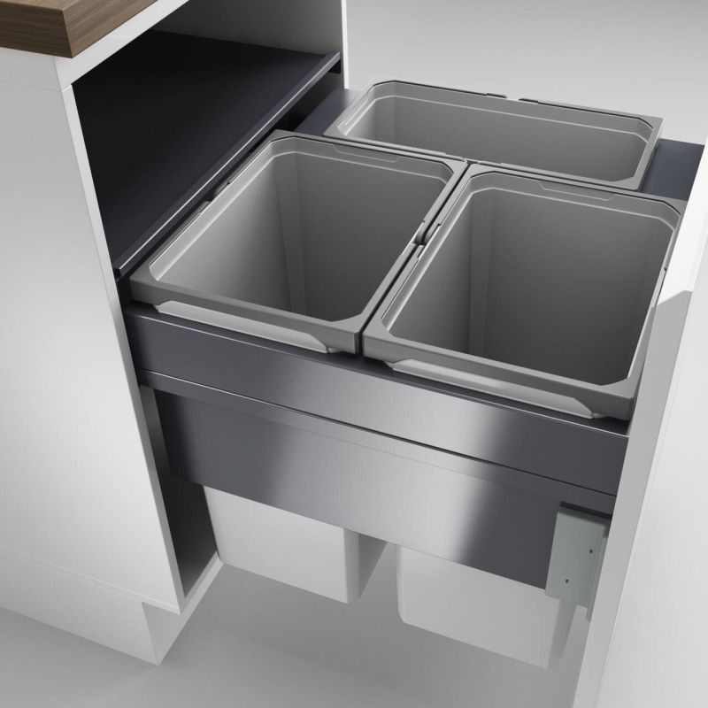 Avec un grand volume de déchets de 80 litres au total, le système de tri des déchets Cox Clan 490/600-3 convainc dans les cuisines des grands ménages. Le modèle est prévu pour des meubles bas de 600 mm de large avec tiroir frontal. Il est équipé de trois poubelles amovibles d'une contenance de 2x 29,5 litres et 1x 21 litres. Le couvercle stable, qui peut également être utilisé comme surface de rangement dans l'armoire, est fabriqué dans un matériau revêtu par poudre. Grâce à la fermeture en douceur et à l'amortissement de la butée, l'insertion du système se fait en silence et en douceur. Pour le montage, les glissières et le boulon de réception du couvercle de rangement sont fixés à la paroi de l'armoire. L'installation est complétée par la fixation du panneau frontal de l'armoire.