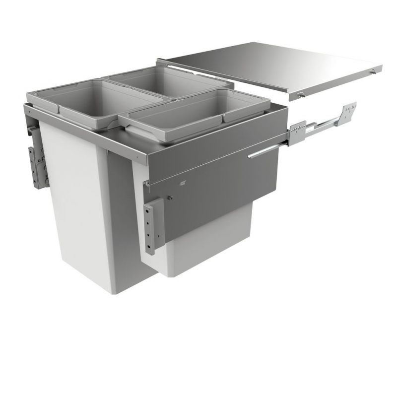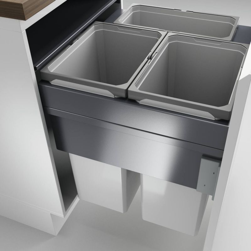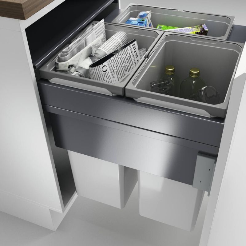 En savoir plus ...Avec un grand volume de déchets de 80 litres au total, le système de tri des déchets Cox Clan 490/600-3 convainc dans les cuisines des grands ménages. Le modèle est prévu pour des meubles bas de 600 mm de large avec tiroir frontal. Il est équipé de trois poubelles amovibles d'une contenance de 2x 29,5 litres et 1x 21 litres. Le couvercle stable, qui peut également être utilisé comme surface de rangement dans l'armoire, est fabriqué dans un matériau revêtu par poudre. Grâce à la fermeture en douceur et à l'amortissement de la butée, l'insertion du système se fait en silence et en douceur. Pour le montage, les glissières et le boulon de réception du couvercle de rangement sont fixés à la paroi de l'armoire. L'installation est complétée par la fixation du panneau frontal de l'armoire.