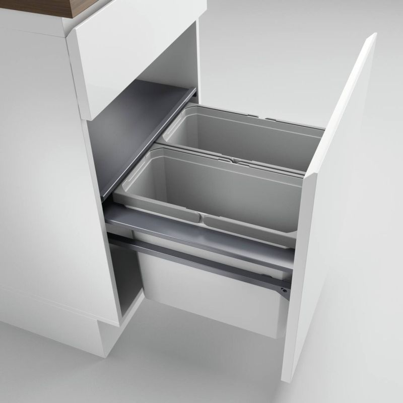 Cette poubelle suspendue s'installe dans un caisson bas de cuisine de largeur 500mm.