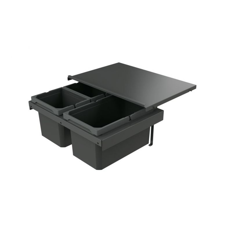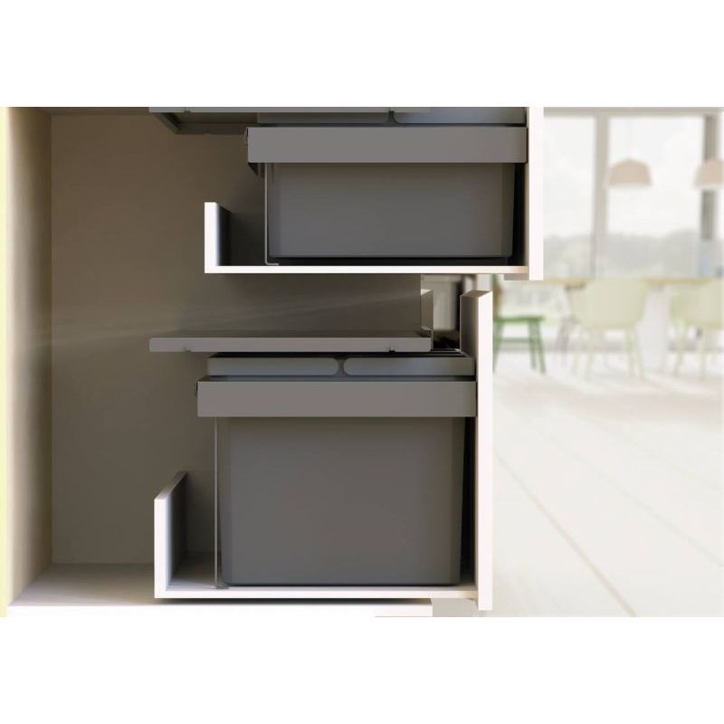 Le système intelligent de tri des déchets Système de tri des déchets Cox Stand-UP® 280 S/600-2 se distingue par sa profondeur de montage minimale. Il est spécialement adapté aux tiroirs d'armoires déjà existants avec une largeur de corps de 60 cm. Le système intègre deux collecteurs de déchets séparés d'une capacité de 16 litres chacun. Le volume total des déchets disponibles est donc de 32 litres. Un cadre robuste sert de base aux récipients, qui peuvent être retirés et transportés sans problème. Ils sont fermés par le couvercle général qui reste dans le corps de l'armoire tout en prenant peu de place. Un couvercle de fermeture séparé pour les déchets biologiques est également disponible en option. De plus, le système de déchets peut être complété par la boîte à ustensiles Cox Work pour les petites pièces. Le montage simple de la poubelle encastrable s'effectue directement sur la tablette coulissante.