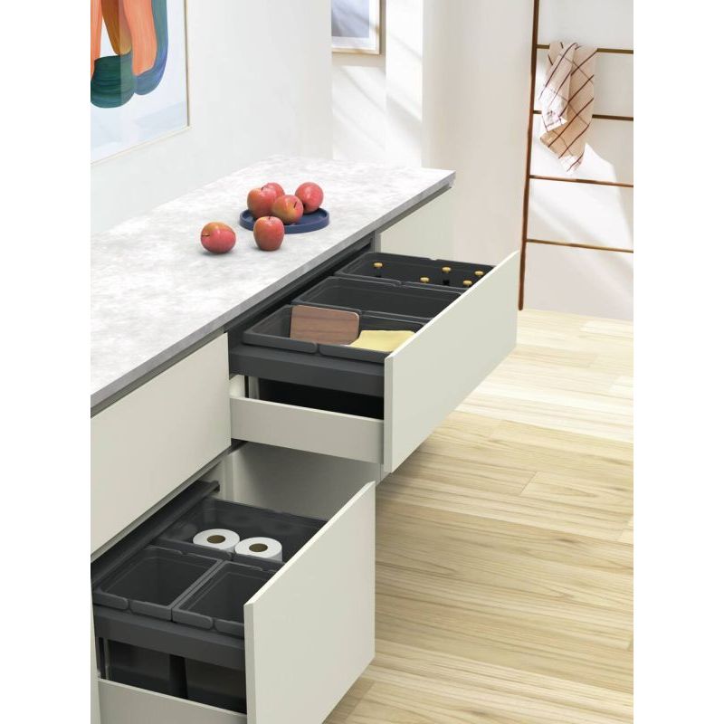 Le système de tri des déchets Cox Stand-UP® 250 S/800-4 permet de trier les déchets sans effort et de manière claire. Il est adapté aux tiroirs d'armoire existants d'une largeur de 80 cm. Il offre une profondeur de montage minimale, de sorte qu'il reste encore de la place derrière pour une installation d'évier. Le collecteur de déchets a un volume total de 35 litres, répartis en 1 x 13 litres, 1 x 10 litres et 2 x 6 litres. Ainsi, les déchets biologiques peuvent également être facilement triés. Les poubelles de qualité supérieure se trouvent dans un cadre stable, duquel elles peuvent être retirées sans problème en cas de besoin. Elles disposent en outre de poignées rabattables pour un transport sans effort. Un couvercle global, qui reste dans l'armoire, ferme le tri des déchets. Celui-ci peut également être installé derrière la façade supérieure afin de gagner de la place. La boîte à ustensiles Cox Work, disponible séparément, permet en outre de ranger les petits objets à portée de main. Le montage du système de tri des déchets est prévu sur le fond du tiroir de l'armoire.