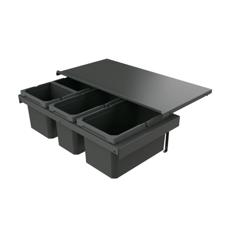 En savoir plus ...Le système de tri des déchets moderne Cox Stand-UP 250 S/800-3 a été conçu pour une utilisation peu encombrante dans les coulissants existants. Il s'intègre facilement dans les meubles bas larges de 800 mm, même si le siphon et les raccords d'eau se trouvent encore derrière. La poubelle se compose de trois récipients, d'une capacité de 1x 10 litres et de 2x 13 litres chacun, soit un volume total de 36 litres. Toutes les poubelles peuvent être retirées individuellement du cadre robuste et transportées sans effort grâce aux poignées rabattables. Pour le recouvrement, on utilise le couvercle total qui peut être monté à volonté directement derrière la façade supérieure. Celui-ci peut en outre être combiné avec la boîte à ustensiles Cox Work, qui est disponible séparément. Le montage de la poubelle encastrable s'effectue sur la tablette coulissante et le panneau frontal.