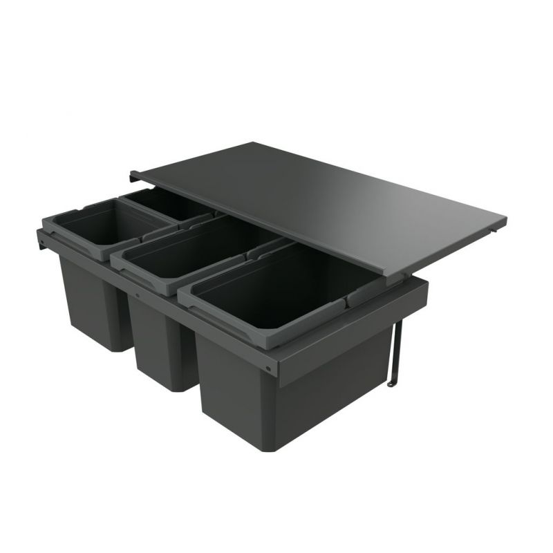 Avec sa faible profondeur de montage de seulement 31 cm, le système de tri des déchets Cox Stand-UP 350 K/800-3 est spécialement adapté aux coulissants courts existants. Il peut être choisi pour des largeurs de corps de 60 à 90 cm. Malgré ses dimensions compactes, la poubelle encastrable convainc par son grand volume total de 30,5 litres. Ce volume est réparti entre les trois récipients carrés de haute qualité de 1 x 15,5 litres et 2 x 7,5 litres. Chaque poubelle peut être retirée individuellement du cadre de support stable. Les anses rabattables pratiques aident à cette opération. Le concept de tri des déchets est fermé par un couvercle global qui peut être monté derrière la façade supérieure pour gagner de la place. Des couvercles bio résistants aux odeurs sont également disponibles en accessoires pour les différents conteneurs. Pour une fixation rapide, le support est simplement vissé au fond du coulissant.