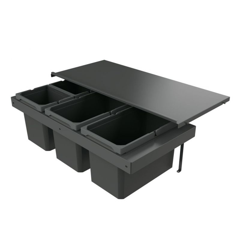 Le système de tri des déchets au design moderne Cox Stand-UP 280 S/900-3 met à disposition un volume de déchets généreux de 48 litres. Il a été spécialement conçu pour les armoires coulissantes d'une largeur de corps de 900mm. Les trois poubelles correspondantes ont une capacité de 16 litres chacune. Elles sont encastrées dans un cadre de montage robuste et peuvent être retirées individuellement. Pour faciliter leur manipulation, elles sont en outre dotées de poignées rabattables pratiques. Les odeurs désagréables sont supprimées par le couvercle général qui se trouve au-dessus et qui est solidement intégré dans le corps de la poubelle. Un couvercle de fermeture séparé pour les déchets biologiques ainsi que la boîte à ustensiles Cox Work pour les sacs poubelle et autres petites pièces sont disponibles en tant qu'accessoires optionnels. Le système de tri des déchets se monte sur le fond de l'armoire.