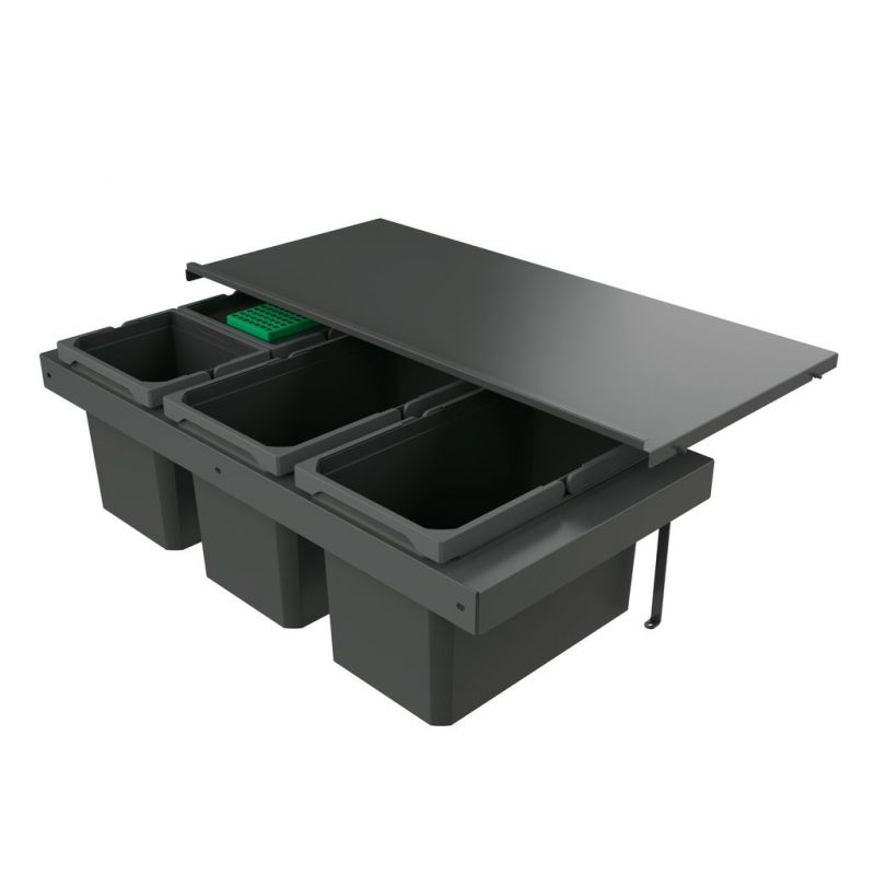 Le système de tri des déchets au design moderne Cox Stand-UP 280 S/900-3 met à disposition un volume de déchets généreux de 48 litres. Il a été spécialement conçu pour les armoires coulissantes d'une largeur de corps de 900mm. Les trois poubelles correspondantes ont une capacité de 16 litres chacune. Elles sont encastrées dans un cadre de montage robuste et peuvent être retirées individuellement. Pour faciliter leur manipulation, elles sont en outre dotées de poignées rabattables pratiques. Les odeurs désagréables sont supprimées par le couvercle général qui se trouve au-dessus et qui est solidement intégré dans le corps de la poubelle. Un couvercle de fermeture séparé pour les déchets biologiques ainsi que la boîte à ustensiles Cox Work pour les sacs poubelle et autres petites pièces sont disponibles en tant qu'accessoires optionnels. Le système de tri des déchets se monte sur le fond de l'armoire.