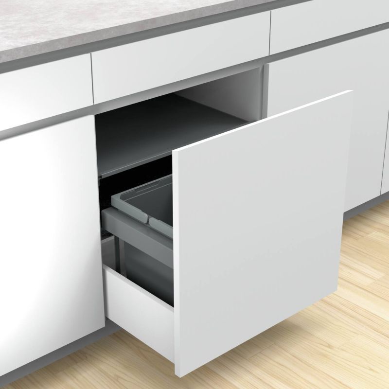 Le système de tri des déchets confortable Cox Stand-UP® 350 S/500-3 offre un montage rapide dans les coulissants existants tout en ayant une profondeur de montage minimale. Il convient aux armoires de cuisine d'une largeur de corps de 50 cm. Un volume total de 36 litres de déchets est disponible, réparti sur trois poubelles de qualité de 10 et 16 litres. Celles-ci sont fixées par un cadre d'encastrement stable et peuvent être retirées individuellement. Les poignées rabattables assurent une manipulation simple. On a également pensé à un couvercle, car le système intègre un couvercle global qui est installé de manière fixe dans l'armoire. En outre, des couvercles de fermeture individuels pour les petites ou grandes poubelles sont disponibles dans les accessoires. Le montage simple s'effectue directement sur le fond du tiroir de l'armoire.