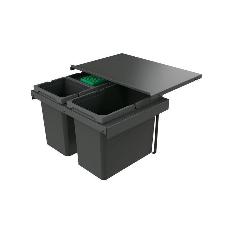 Le système intelligent de tri des déchets Système de tri des déchets Cox Stand-UP® 280 S/600-2 se distingue par sa profondeur de montage minimale. Il est spécialement adapté aux tiroirs d'armoires déjà existants avec une largeur de corps de 60 cm. Le système intègre deux collecteurs de déchets séparés d'une capacité de 16 litres chacun. Le volume total des déchets disponibles est donc de 32 litres. Un cadre robuste sert de base aux récipients, qui peuvent être retirés et transportés sans problème. Ils sont fermés par le couvercle général qui reste dans le corps de l'armoire tout en prenant peu de place. Un couvercle de fermeture séparé pour les déchets biologiques est également disponible en option. De plus, le système de déchets peut être complété par la boîte à ustensiles Cox Work pour les petites pièces. Le montage simple de la poubelle encastrable s'effectue directement sur la tablette coulissante.