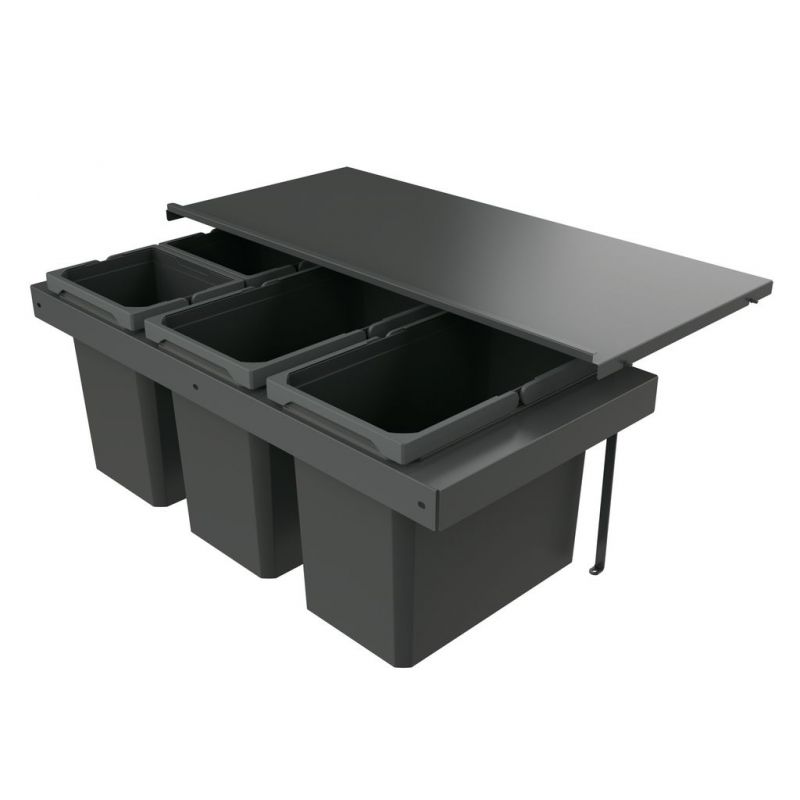 Le système de tri des déchets au design moderne Cox Stand-UP 280 S/900-3 met à disposition un volume de déchets généreux de 48 litres. Il a été spécialement conçu pour les armoires coulissantes d'une largeur de corps de 900mm. Les trois poubelles correspondantes ont une capacité de 16 litres chacune. Elles sont encastrées dans un cadre de montage robuste et peuvent être retirées individuellement. Pour faciliter leur manipulation, elles sont en outre dotées de poignées rabattables pratiques. Les odeurs désagréables sont supprimées par le couvercle général qui se trouve au-dessus et qui est solidement intégré dans le corps de la poubelle. Un couvercle de fermeture séparé pour les déchets biologiques ainsi que la boîte à ustensiles Cox Work pour les sacs poubelle et autres petites pièces sont disponibles en tant qu'accessoires optionnels. Le système de tri des déchets se monte sur le fond de l'armoire.