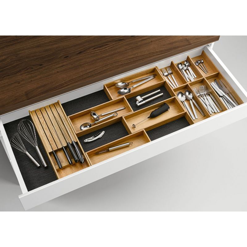 En savoir plus ...Les inserts pour tiroirs Modify Set 800/900 avec tapis antidérapant permettent d'avoir plus d'ordre et de clarté dans le tiroir de la cuisine. L'équipement comprend un range-couverts et quatre bacs qui offrent un espace de rangement pour les couverts, les pelles à tarte ou les tire-bouchons. Grâce au tapis antidérapant fourni, le bloc-tiroir ne glisse pas dans le meuble bas. Le matériau utilisé est un bois durable et de haute qualité. L'équipement du meuble bas peut être commandé en différentes couleurs pour s'adapter au concept d'aménagement existant : Chêne clair et Frêne noir.