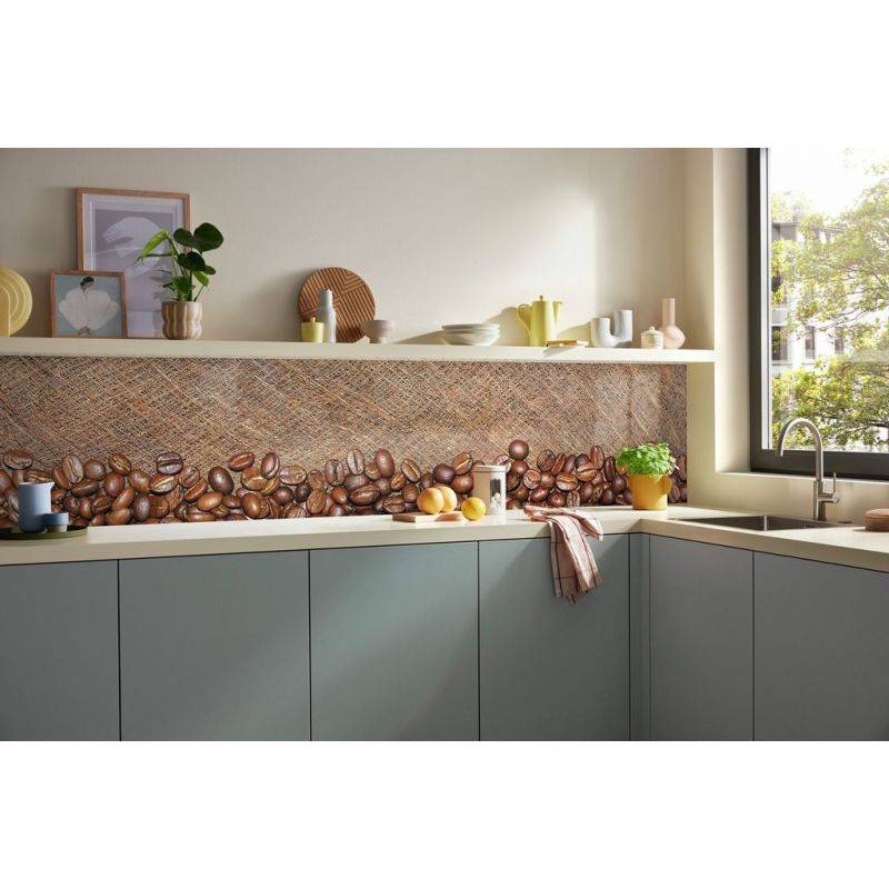 Crédence murale PICit® 92 - Grains de café sur fond en sac en toile de jute, aluminium, 3.5 mm, brillant