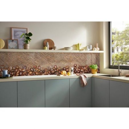 Crédence murale PICit® 92 - Grains de café sur fond en sac en toile de jute, acrylique, 16 mm, brillant