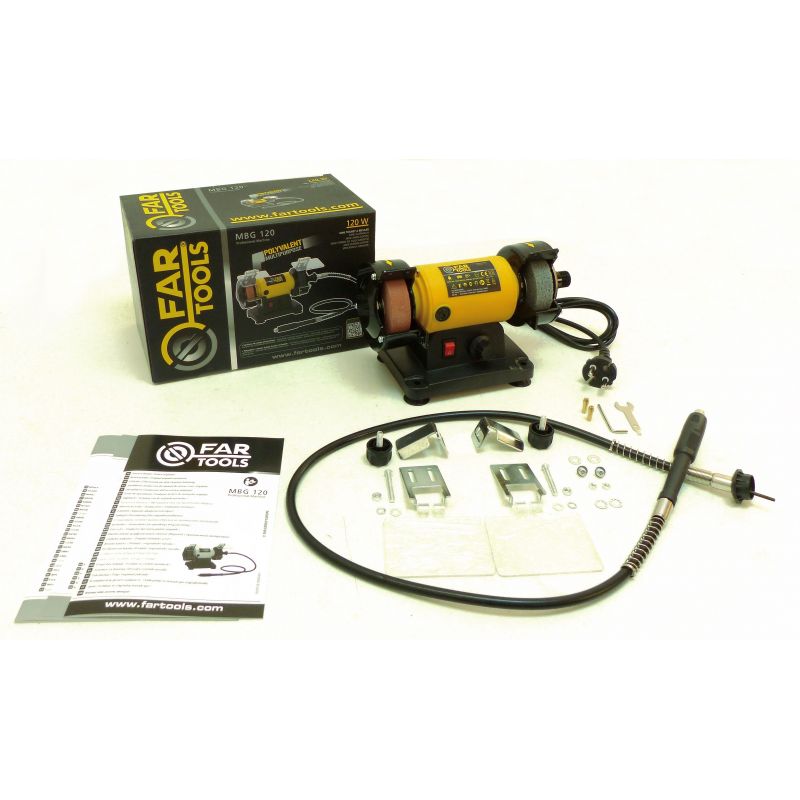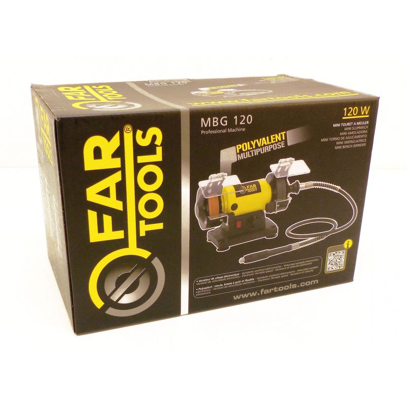 Mini touret à meuler de 120 W Ø75mm avec flexible - Vitesse variable de 0-9900tr/min - Polyvalent: meule, brosse à polir et flexible connecté à l'arbre - 2 écrans polycarbonates - Pour nettoyer, lustrer, polir, affuter et meuler tous types de matériaux - Vitesse de rotation variable pour des travaux efficace et sur tout supports -Livré avec 1 Meule, 1 brosse et flexible connectable à l'arbre.