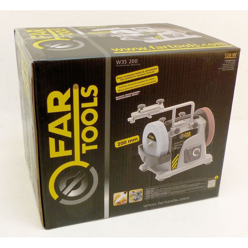 Affûteur à eau de 120W Ø200mm- Vitesse variable de 30à150tr/min - Inverseur de sens et couple réglable - Poignée de transport - Livré avec pate à graisser - Pierre à polir et rapporteur d'angles, usage Ebauche & finition - Pour affuter à l'eau de manière précise tout objet métallique - Avec la meule de 200mm, son variateur de vitesse et son changement de sens de rotation en font un produit facile d'utilisation et efficace - Idéal pour affuter tous les outils.