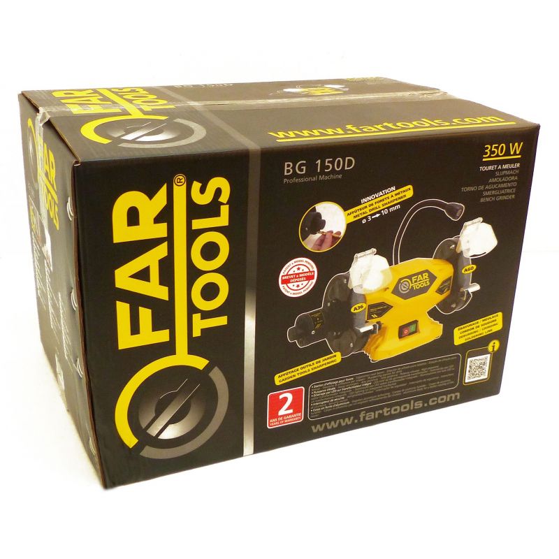 Touret à meuler de 400W meule-meule 2xØ150mm (grain A36 & A60) avec affuteur de forets - Lampe LED et vitesse de rotation de 2950tr/min avec 2 écrans polycarbonates - Corps en alu pour une meilleure diffusion de la chaleur - Pour meuler, aiguiser et décaper tous types d'outils métalliques - Moteur puissant, éclairage et support d'outils en font une machine performante - Pour décapage fort sur surfaces résistantes avec toujours la fonction brevetée d'affuteur de forets FARTOOLS.