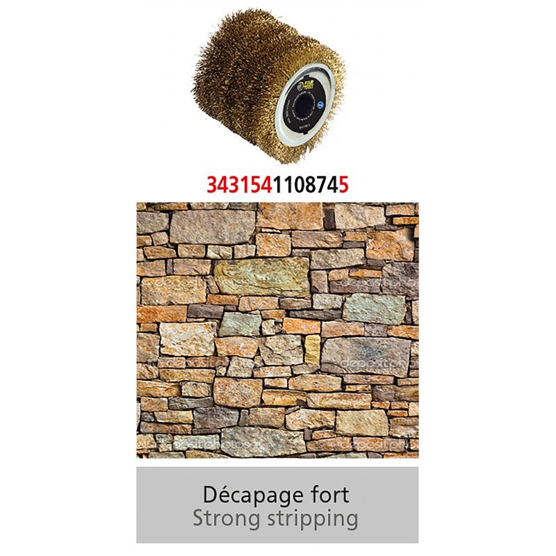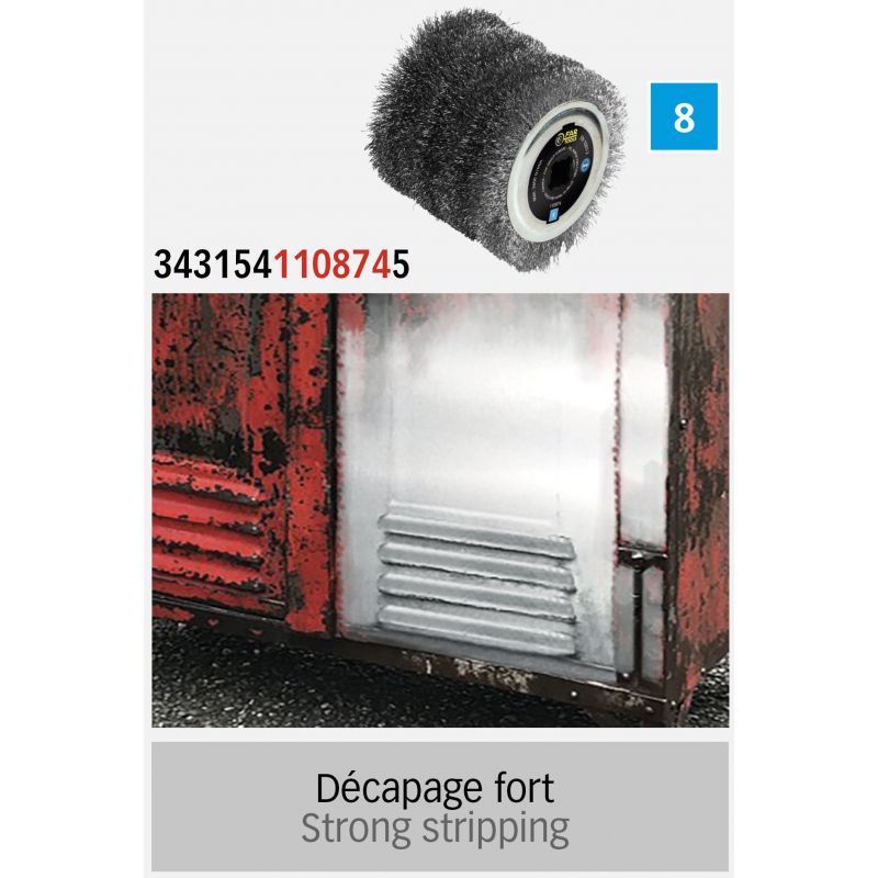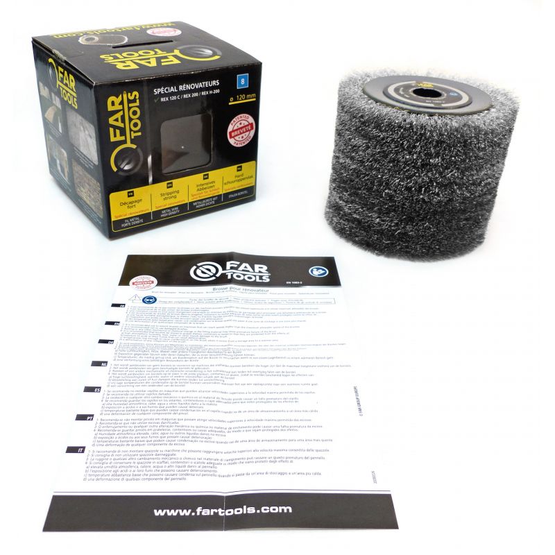 Brosse fil métallique Ø120mm - L 100mm pour décaper fortement le bois ou le métal (surfaces complexes ou planes). Compatible avec machines REX120C, REX200 et REX-H-200.
