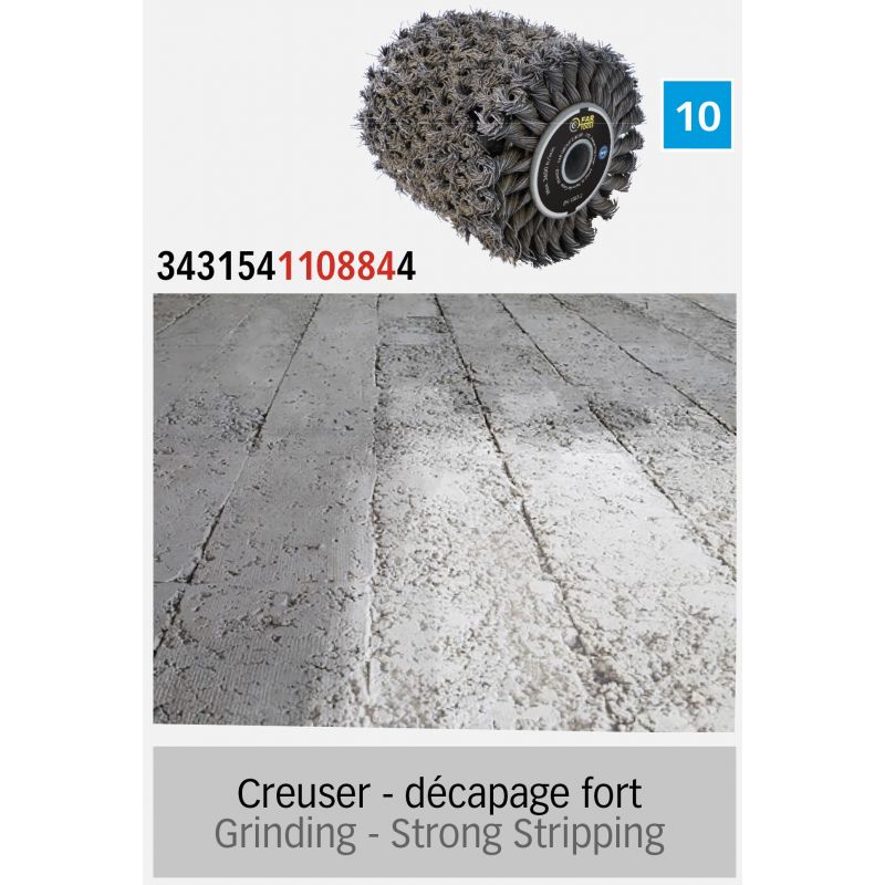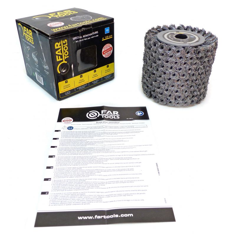 Brosse fil métallique torsadé Ø120mm - L 100mm pour surfacer la pierre ou le béton ou décaper fortement le métal (surfaces complexes ou planes). Compatible avec machines REX120C, REX200 et REX-H-200.