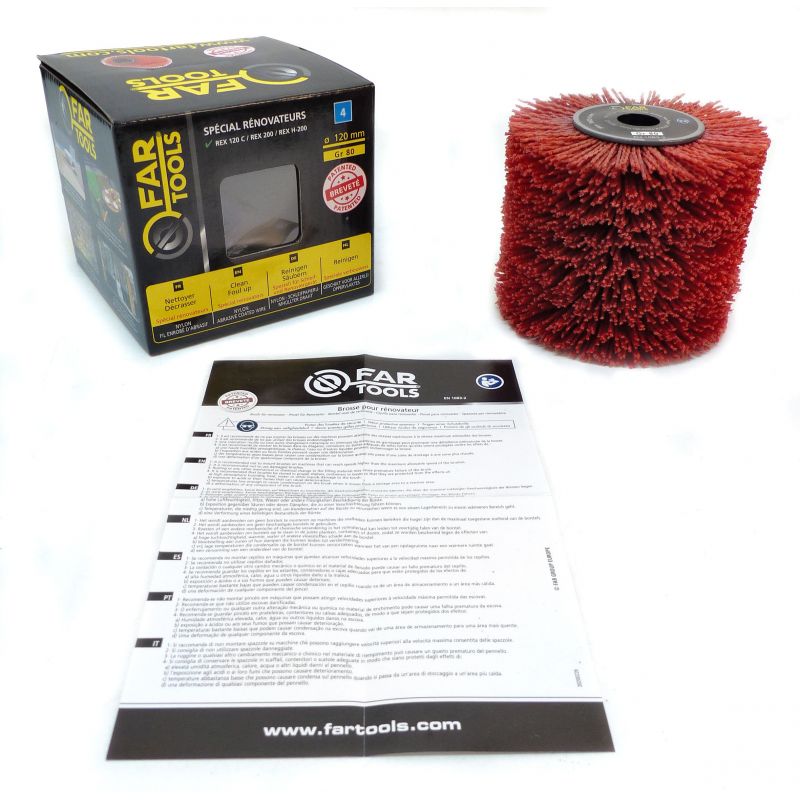 Brosse nylon abrasifs grain80 Ø120mm - L 100mm pour décrasser/dégriser/nettoyer le bois, le métal ou la pierre (surfaces complexes ou planes). Compatible avec machines REX120C, REX200 et REX-H-200.