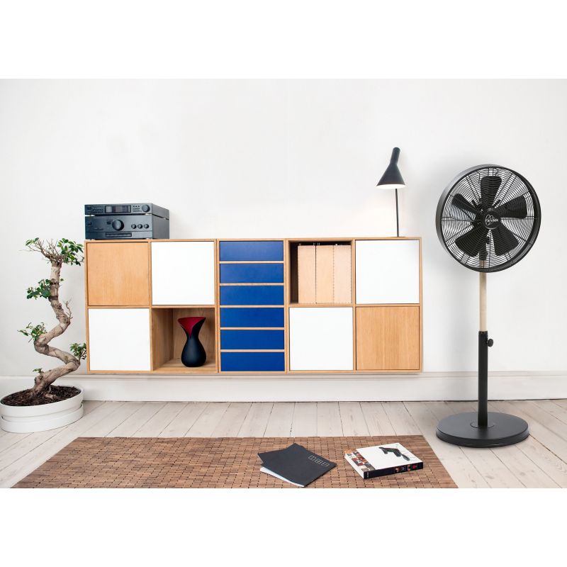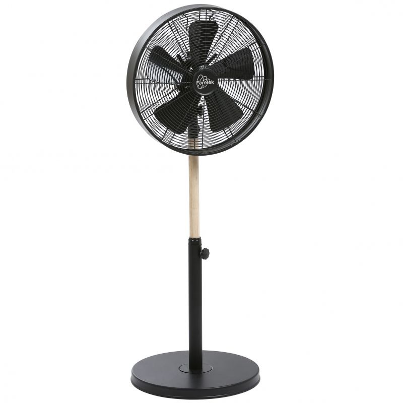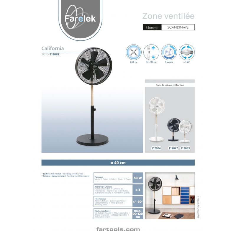 Ventilateur sur pied CALIFORNIA 50W - Diamètre 40cm - Design scandinave associant bois (pin naturel) et métal (noir mat) - Hauteur réglable de 90 à 120cm - Selecteur 3 vitesses - Tête oscillante droite/gauche +/- 60°, forme canon pour un flux d'air optimisé.