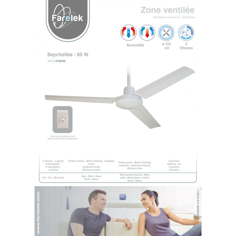 Ventilateur de plafond SEYCHELLES 65W - Diamètre 122cm - pale en métal - Finition moteur en blanc et pales en blanc - 3 vitesses- Réversible pour rafraichir en douceur l'ensemble d'une pièce de manière prolongée l'été, mais aussi brasser l'air l'hiver afin d'optimiser le chauffage - Interrupteur/variateur mural - Très silencieux. Compatible avec télécommande universelle de ventilateur de plafond (vendue séparemment).