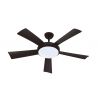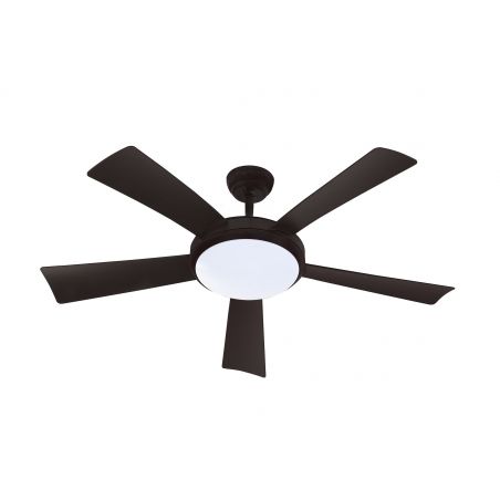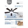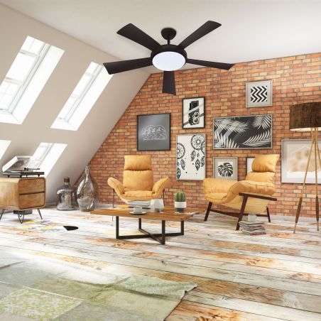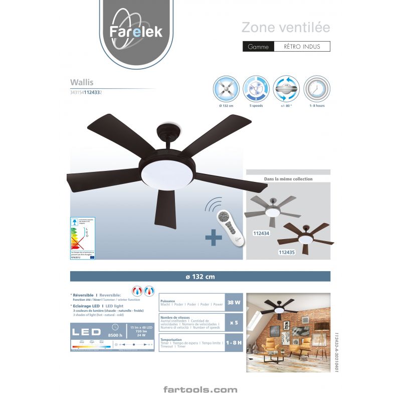Ventilateur de plafond diamètre 132cm, puissance 38W, 9+2 vitesses, plateau d'éclairage LED 1760Lm 18W avec réglage de la couleur lumineuse (2200K : jaune - 4000K : naturel - 6500K : blanc) et de l'intensité de lumière, 5 pales plastique noires, bloc moteur et cabochon en métal noir. Télécommande founie (piles non incluses). Rotation réversible pour une bonne circulation de l'air en été comme en hiver. En été l'air froid est ventilé vers le bas pour une sensation de fraîcheur, et en hiver, l'air chaud accumulé au plafond est ventilé vers le bas pour optimiser son installation de chauffage : poêle à bois ou granulé, cheminée / insert, chauffage central, ou électrique. S'installe très simplement en lieu et place du luminaire de plafond de la pièce à équiper et commandable avec l'interrupteur du luminaire de plafond remplacé. Apairage de la télécommande réalisé en usine donc fonctionne instantanément dès l'installation. La télécommande permet de régler, à distance, la vitesse de rotation, la teinte et l'intensité lumineuse, la temporisation (2/4/6/8H), d'allumer ou éteindre individuellement le ventilateur et/ou l'éclairage LED.