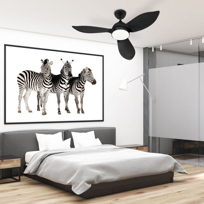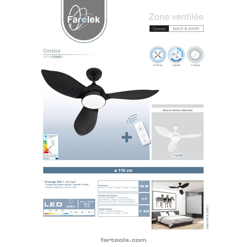 Ventilateur de plafond diamètre 116cm, puissance 70W, 3 vitesses, plateau d'éclairage LED 1500Lm 18W avec réglage de la couleur lumineuse (2200K : jaune - 4000K : naturel - 6500K : blanc) et de l'intensité de lumière, 3 pales plastique blanches, bloc moteur et cabochon en métal blanc. Télécommande founie (piles non incluses). Rotation réversible pour une bonne circulation de l'air en été comme en hiver. En été l'air froid est ventilé vers le bas pour une sensation de fraîcheur, et en hiver, l'air chaud accumulé au plafond est ventilé vers le bas pour optimiser son installation de chauffage : poêle à bois ou granulé, cheminée / insert, chauffage central, ou électrique. S'installe très simplement en lieu et place du luminaire de plafond de la pièce à équiper et commandable avec l'interrupteur du luminaire de plafond remplacé. Apairage de la télécommande réalisé en usine donc fonctionne instantanément dès l'installation. La télécommande permet de régler, à distance, la vitesse de rotation, la teinte et l'intensité lumineuse, la temporisation (2/4/6/8H), d'allumer ou éteindre individuellement le ventilateur et/ou l'éclairage LED.