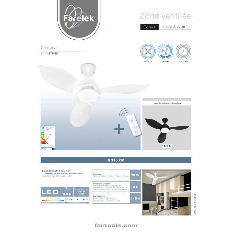 Ventilateur de plafond diamètre 116cm, puissance 70W, 3 vitesses, plateau d'éclairage LED 1500Lm 18W avec réglage de la couleur lumineuse (2200K : jaune - 4000K : naturel - 6500K : blanc) et de l'intensité de lumière, 3 pales plastique noires, bloc moteur et cabochon en métal noir. Télécommande founie (piles non incluses). Rotation réversible pour une bonne circulation de l'air en été comme en hiver. En été l'air froid est ventilé vers le bas pour une sensation de fraîcheur, et en hiver, l'air chaud accumulé au plafond est ventilé vers le bas pour optimiser son installation de chauffage : poêle à bois ou granulé, cheminée / insert, chauffage central, ou électrique. S'installe très simplement en lieu et place du luminaire de plafond de la pièce à équiper et commandable avec l'interrupteur du luminaire de plafond remplacé. Apairage de la télécommande réalisé en usine donc fonctionne instantanément dès l'installation. La télécommande permet de régler, à distance, la vitesse de rotation, la teinte et l'intensité lumineuse, la temporisation (2/4/6/8H), d'allumer ou éteindre individuellement le ventilateur et/ou l'éclairage LED.