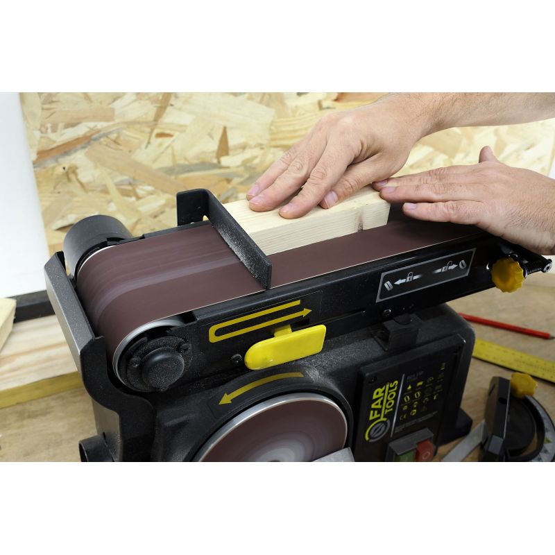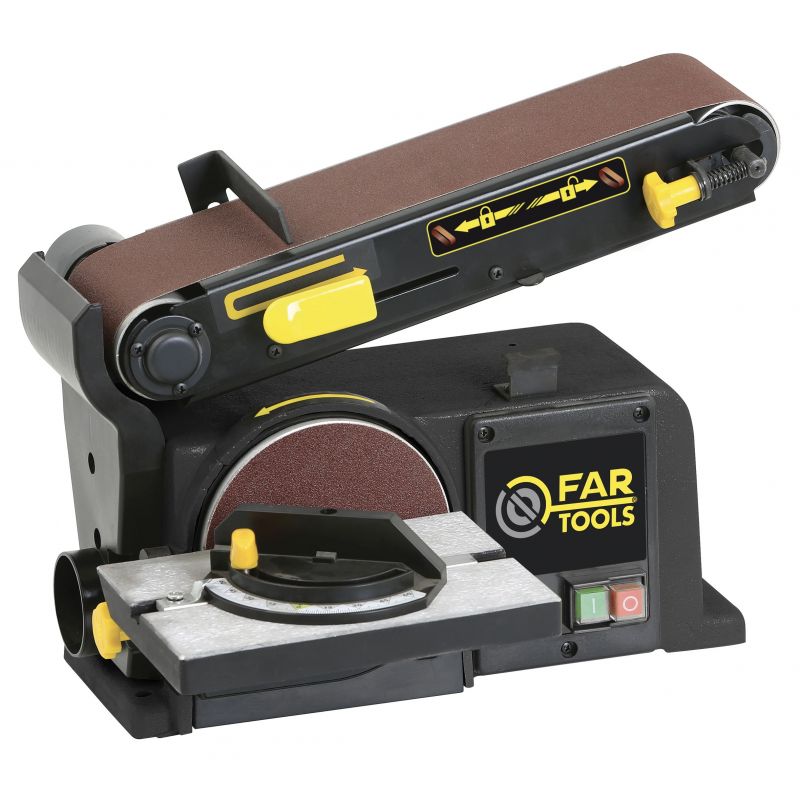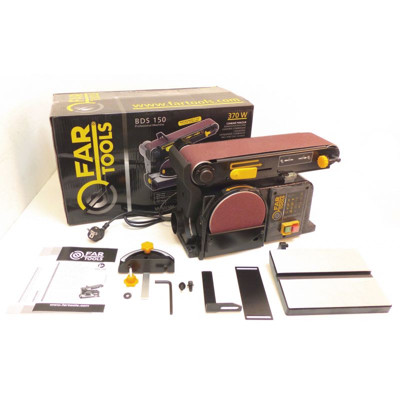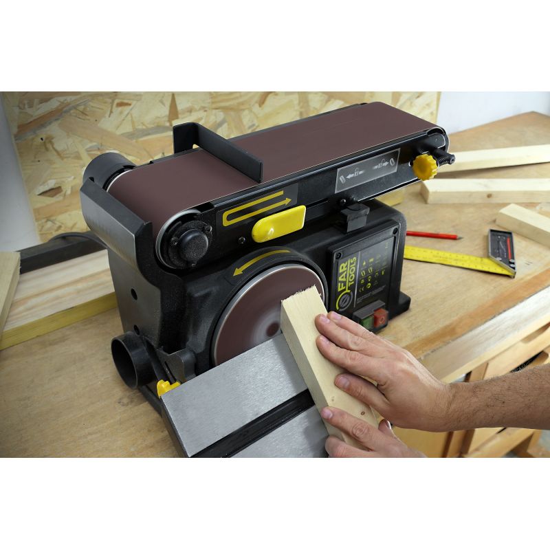Combiné ponceur de 370W - Bande de 100x915mm avec bras inclinable à 90° - Disque Ø150mm - Table adaptable 225x125mm et inclinable à 45° - Corps en fonte pour une grande stabilité - Vitesse de rotation 2850tr/min - Livré avec guide d'angle - Pour poncer tous types de pièces en bois en toute simplicité - Son bras inclinable à 90° et sa table adaptable offrent toutes les orientations et angles pour le ponçage - Idéal pour les petites et moyennes pièces à poncer.
