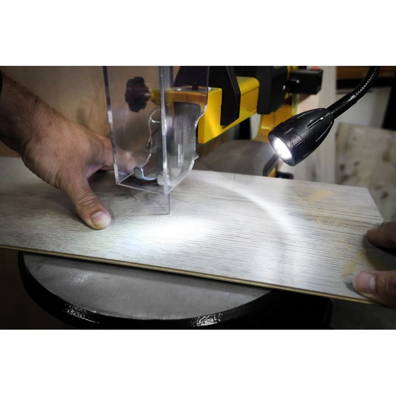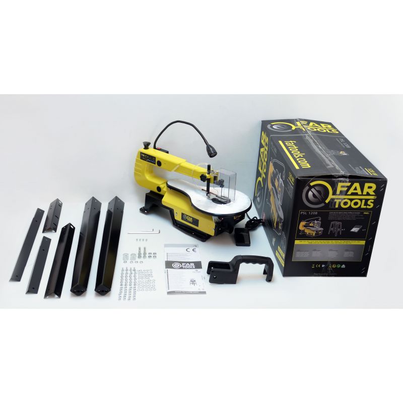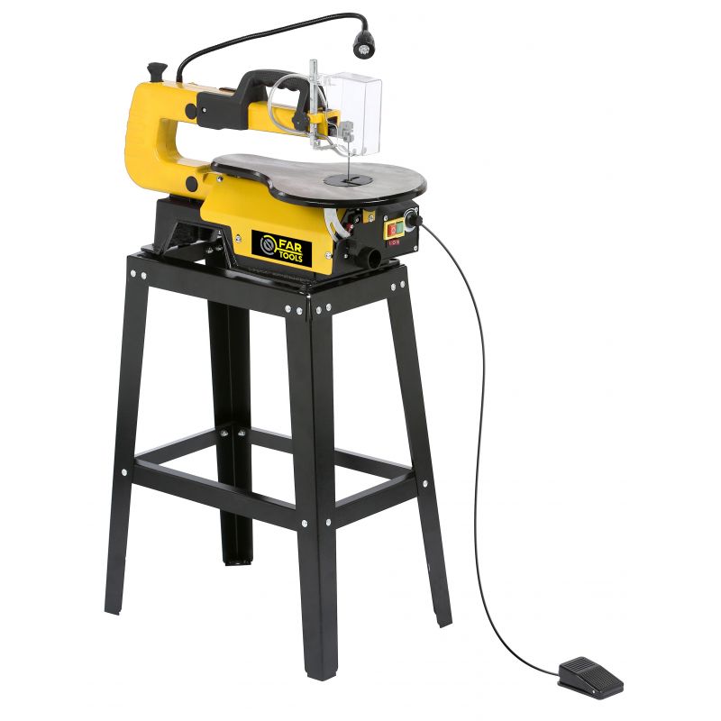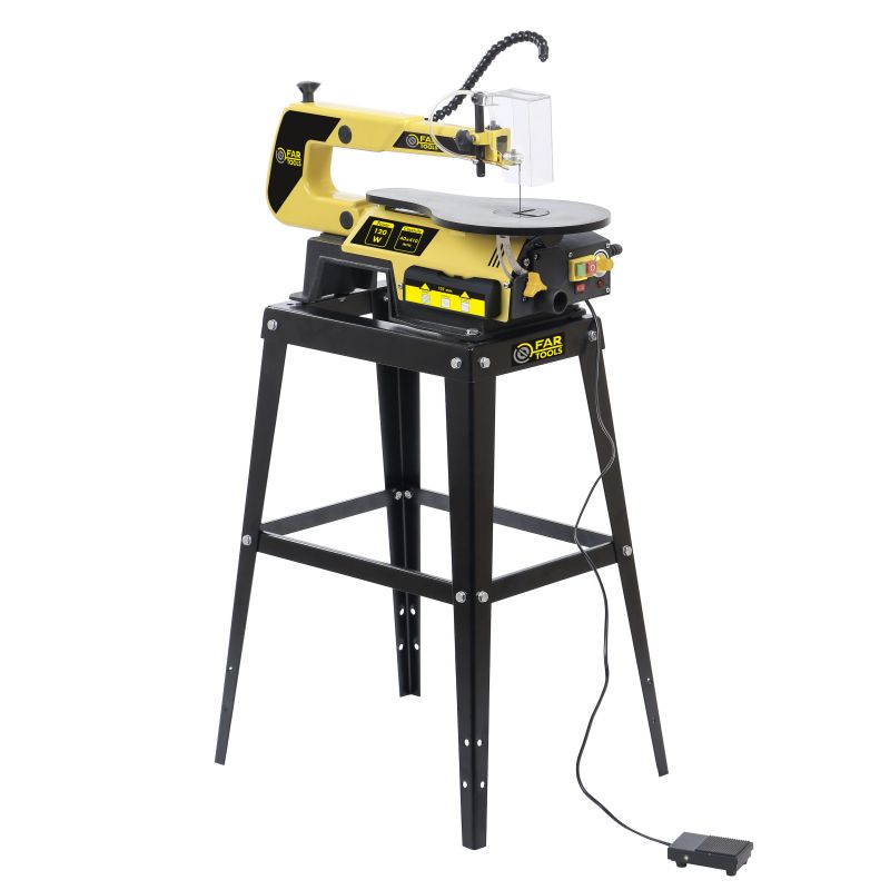 Scie à chantourner de 120W - Démarrage au pied=main libre - Vitesse variable de 400 à 1600trmin - Capacité de coupe 406x45mm - Table inclinable à 45° de 260x411mm - Col de signe de 410mm - Chantournage précis avec lumière et souffleur - Livré avec son support, lampe, souffleur et support lame hélicoïdale - Pour déligner et chantourner en toute simplicité - Son bâti en métal et sa table en fonte en font un outils robuste et précis - Sa vitesse variable et le démarrage au pied en font une machine souple et simple d'usage.