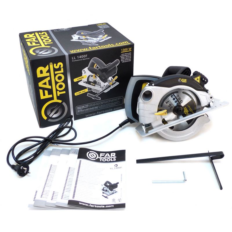 Livré avec une lame 36 dents démontée, un guide parallèle, une clé, 2 piles et un collecteur de poussières.