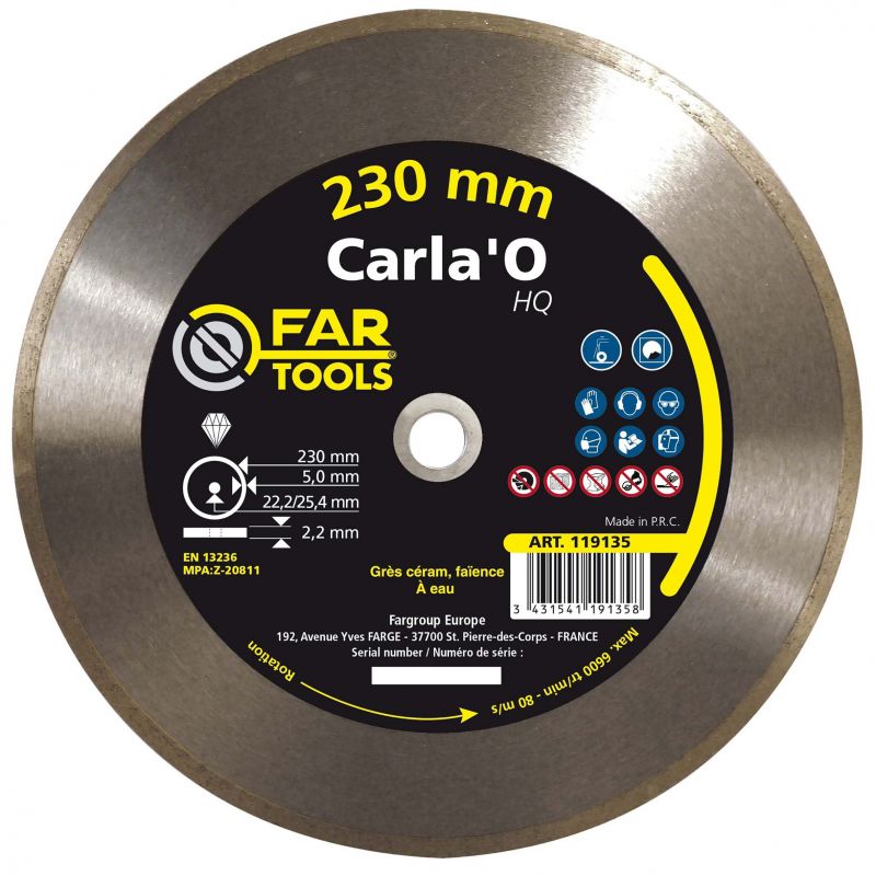 Disque diamant "Carla'O HQ cobalt" Diam, 230 MM, Alésage 22,2 MM, Type de jante Continu , Coupe à eau, Hauteur de jante 5 MM